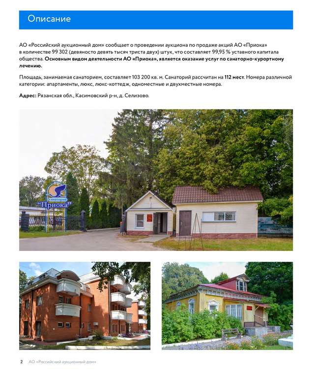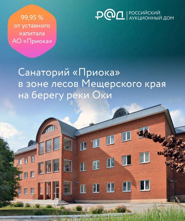 АО "Российский аукционный дом" сообщает о продаже действующего санатория «Приока» (99,95% акций в уставном капитале) .